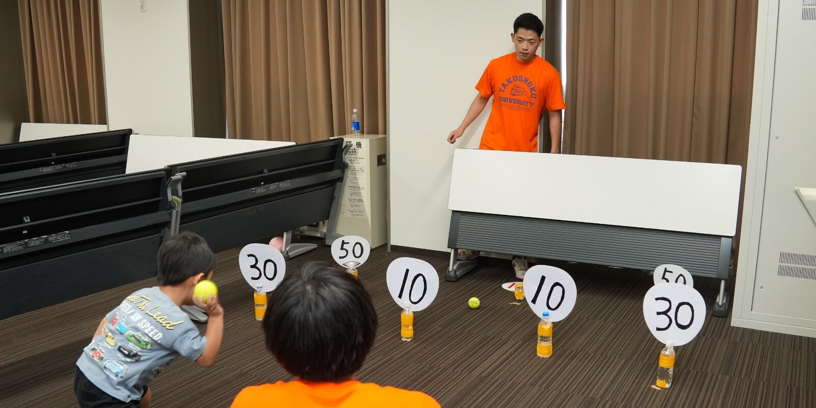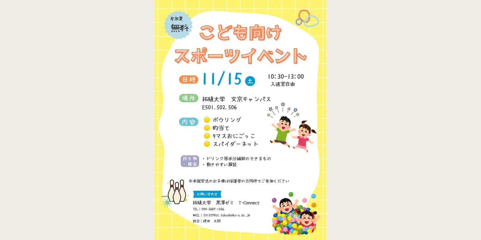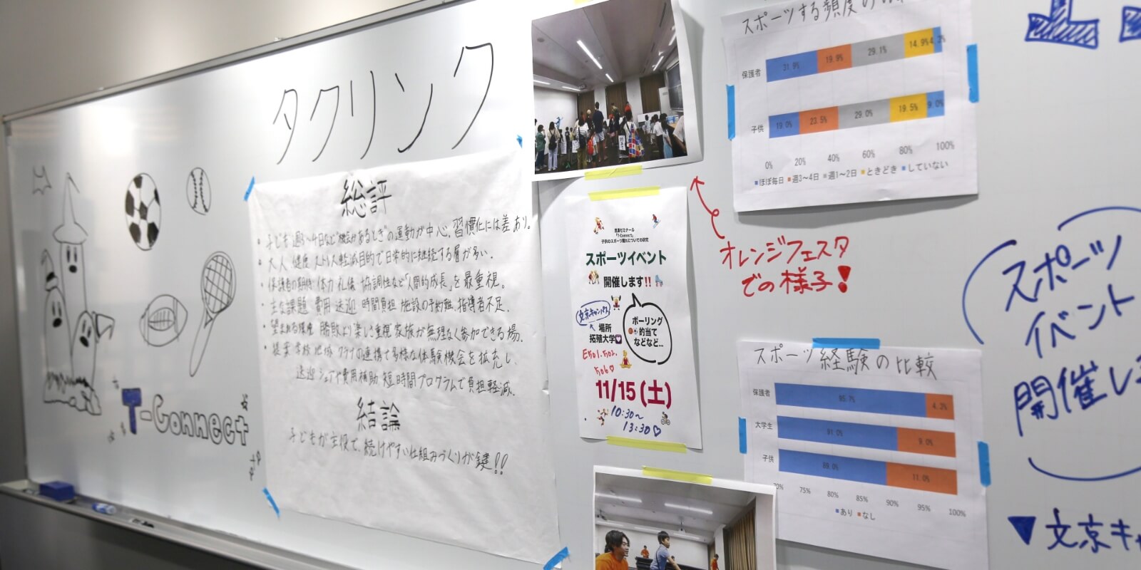 社会問題である子どものスポーツ離れに着目し、私たちは文京キャンパスで毎年開催されているオレンジフェスタにおいて、的当てやボーリングなどのミニゲームを実施した。来場した子どもたちに運動の楽しさを体験してもらうと同時に、スポーツに関するアンケート調査を行い、その結果からスポーツ参加の実態や課題を分析した。その結果、誰でも気軽に運動できる機会が不足していると考え、独自のスポーツイベントを開催。身体を動かす機会を提供することで、子どもたちがスポーツに興味を持つきっかけを作ることに取り組んだ。