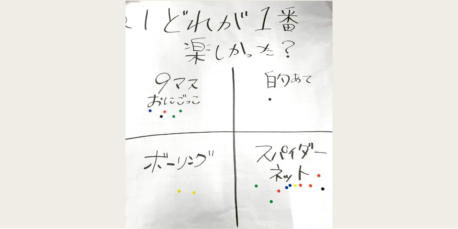 的あてでは黒板にランキングを掲示したことで、何度も挑戦する子どもが多く、特に盛り上がったと感じています。一方、かご入れはバケツとボールの相性が悪く、小さな子どもには難しい場面がありました。サッカーボウリングでは、蹴ることが苦手な子どもが多かったため、手で転がして挑戦してもらうなど状況に応じて柔軟に対応しました。